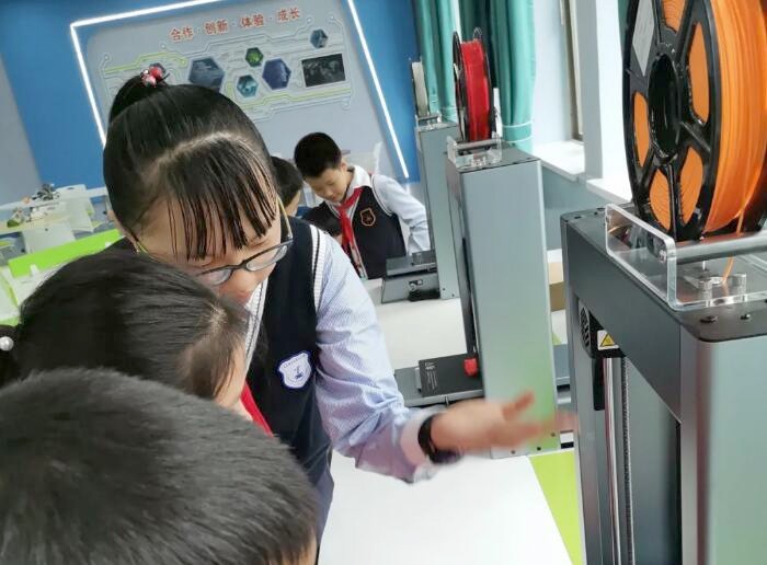 在steam教室里,乐高搭建的投掷器、赛车等模型引起了孩子们一阵阵欢呼,旁边的3D打印机正在努力工作,孩子们一边好奇地观摩着,一边听着学长们的讲解,感受到了科技的魅力。