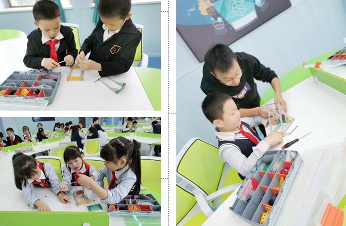 教室的另一边,孩子们正动手搭建秋千,螺丝螺母的吻合,螺丝刀的使用,思维的碰撞……孩子们兴趣高涨,那认真专注的模样,仿佛让我们看到了未来的工程师们。