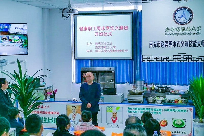 11月7日,由南充市顺庆区总工会、南充市职工大学主办,南充市营养膳食健康协会承办,以“烹营养膳食、做健康职工”为主题的周末厨艺兴趣班在南充市职工大学潆溪校区开班。来自市内30多名厨艺兴趣爱好者参加了开班启动仪式,并全程参加为期两天的理论和实践相结合的培训。