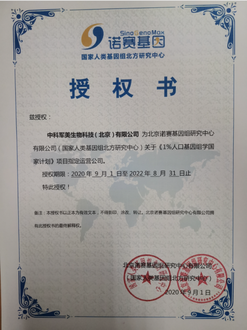 据了解,中科军美生物科技(北京)有限公司是为北京诺赛基因组研究中心有限公司(国家人类基因北方研究中心)关于《1%人口基因组学国家计划》项目指定运营公司,也就是此次基因检测国家计划的具体执行方。国家人类基因组北方研究中心(CHGB)是1998年由国家科技部批准成立的国家基因组研究基地,中心在科研体制改革方面进行了新的有益尝试,实行股份制科研企业的运作模式,并通过北京诺赛基因组研究中心有限公司(SinoGenoMax)的机制促进基因组研究成果商业价值的开发和转化,引导和开创中国基因组产业。